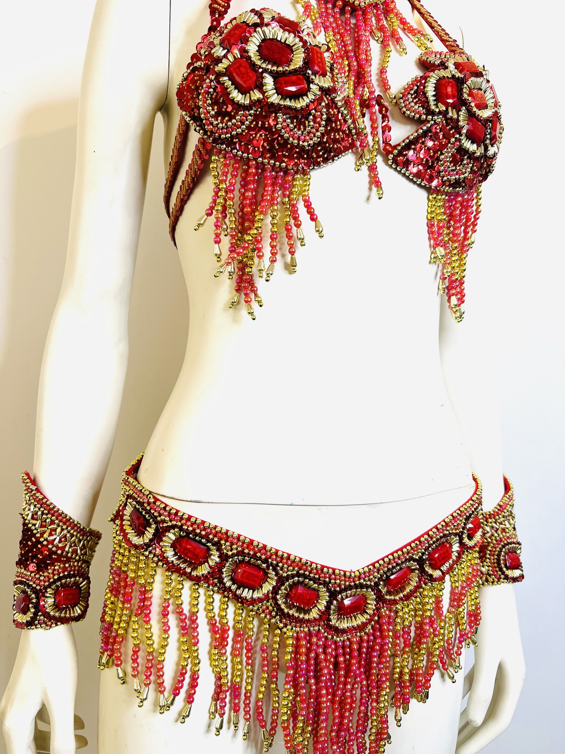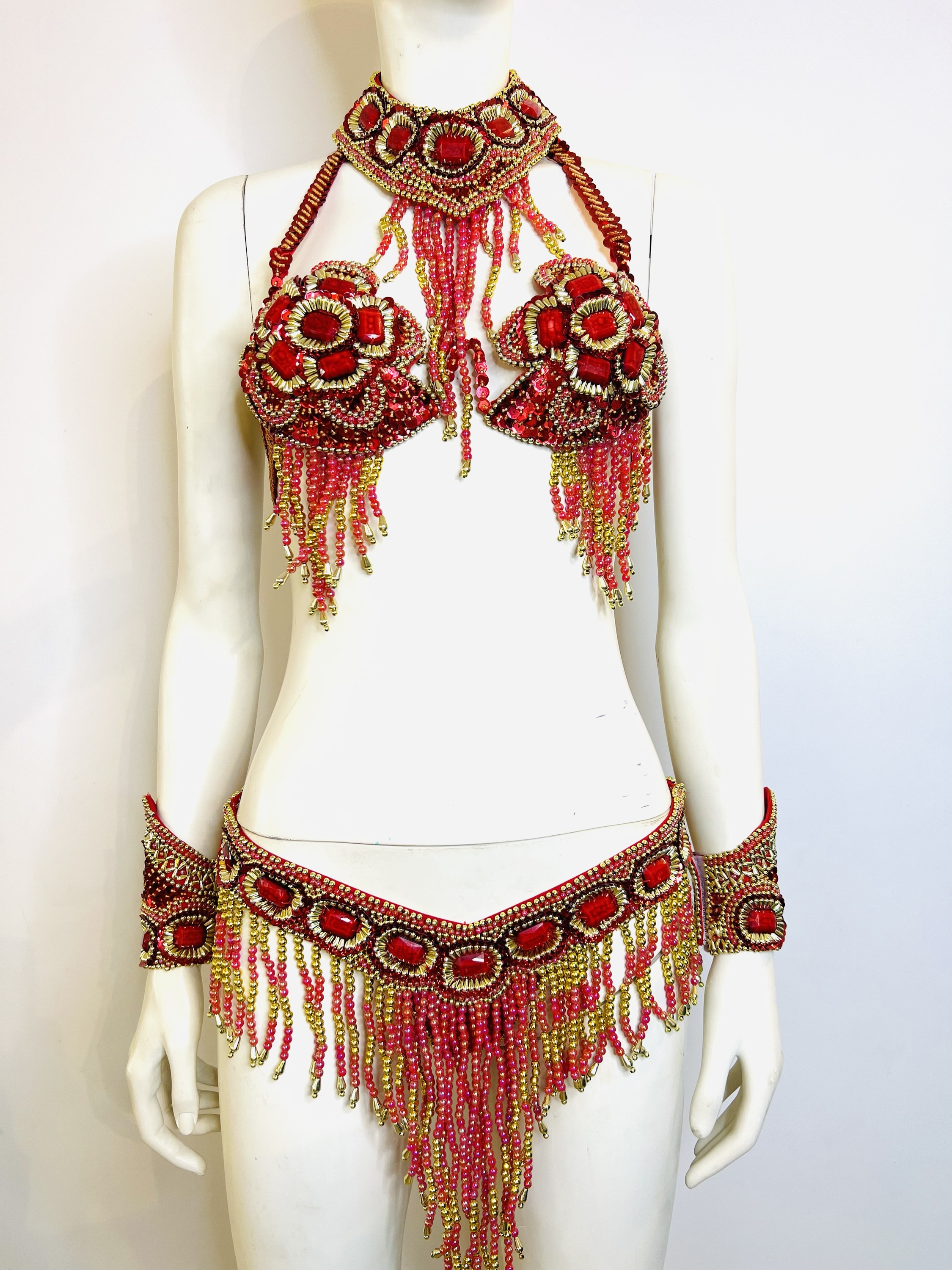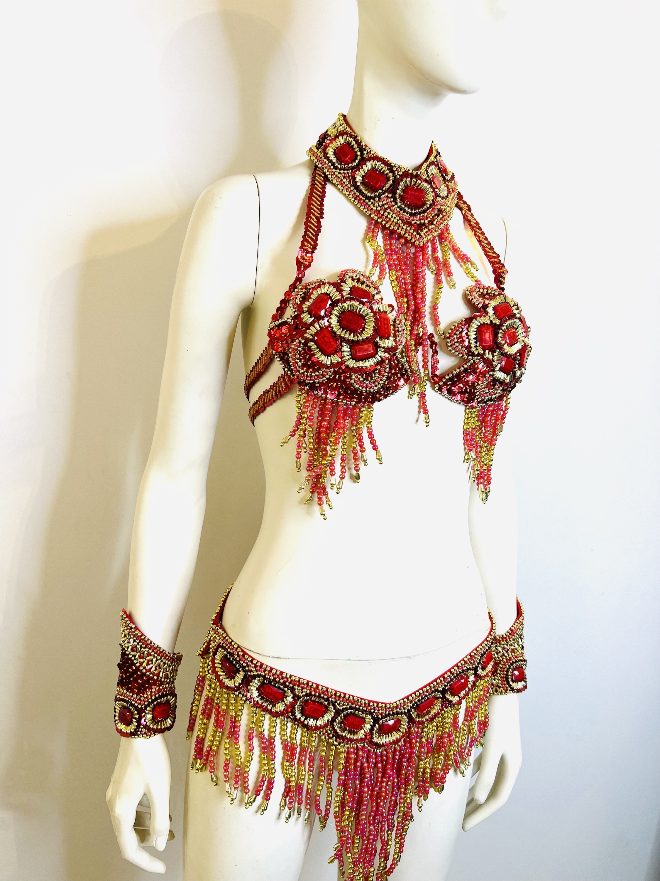 Faites tourner tous les regards avec notre magnifique ensemble Bikini rouge, une pièce maîtresse de délicatesse artisanale où chaque élément, du soutient-gorge au bracelet, est orné de strass et sequins étincelants. Symbole d’élégance, sa teinte rouge enflammée et ses ornements scintillants évoquent une danse de lumière et de passion.taille S