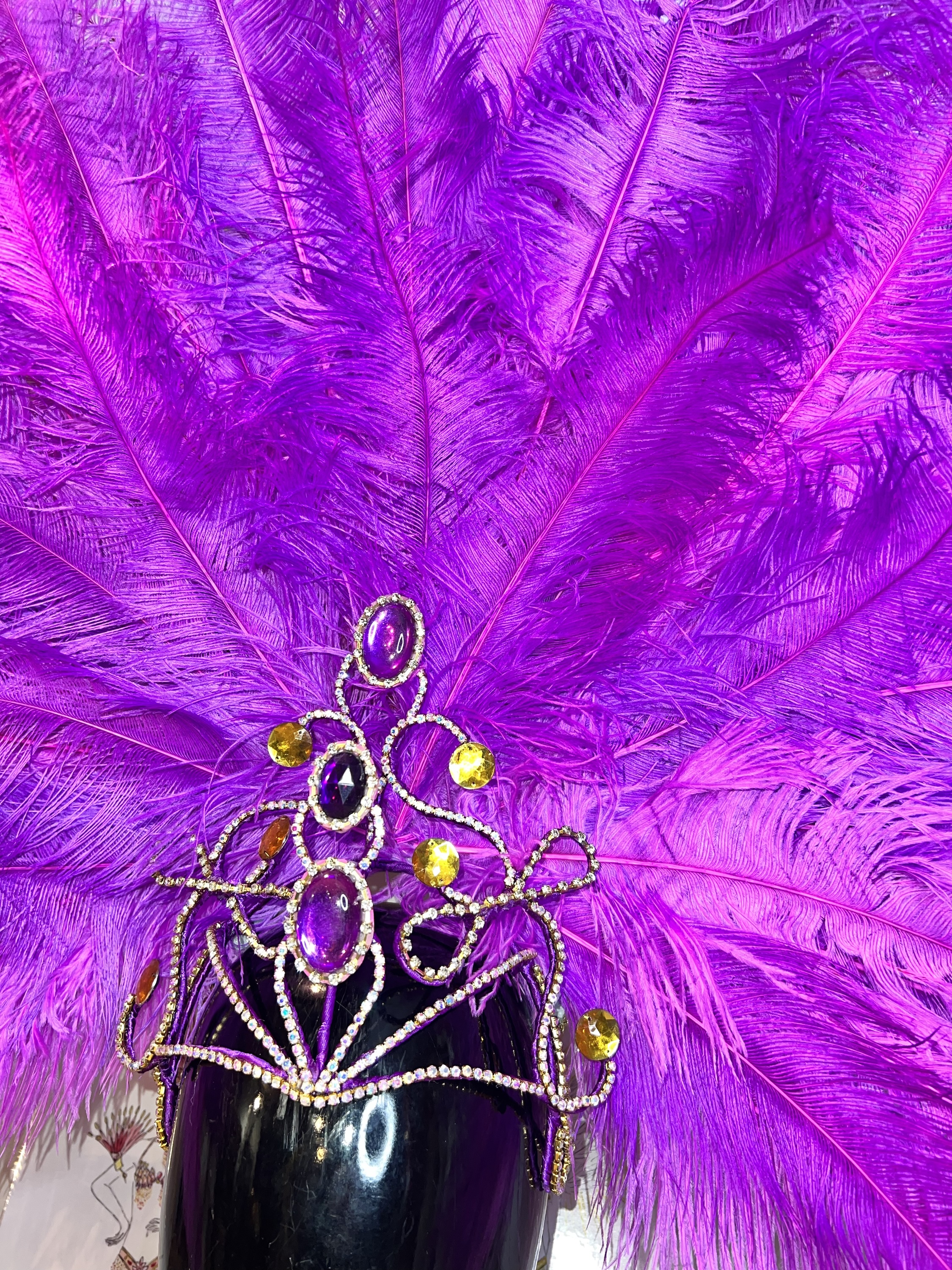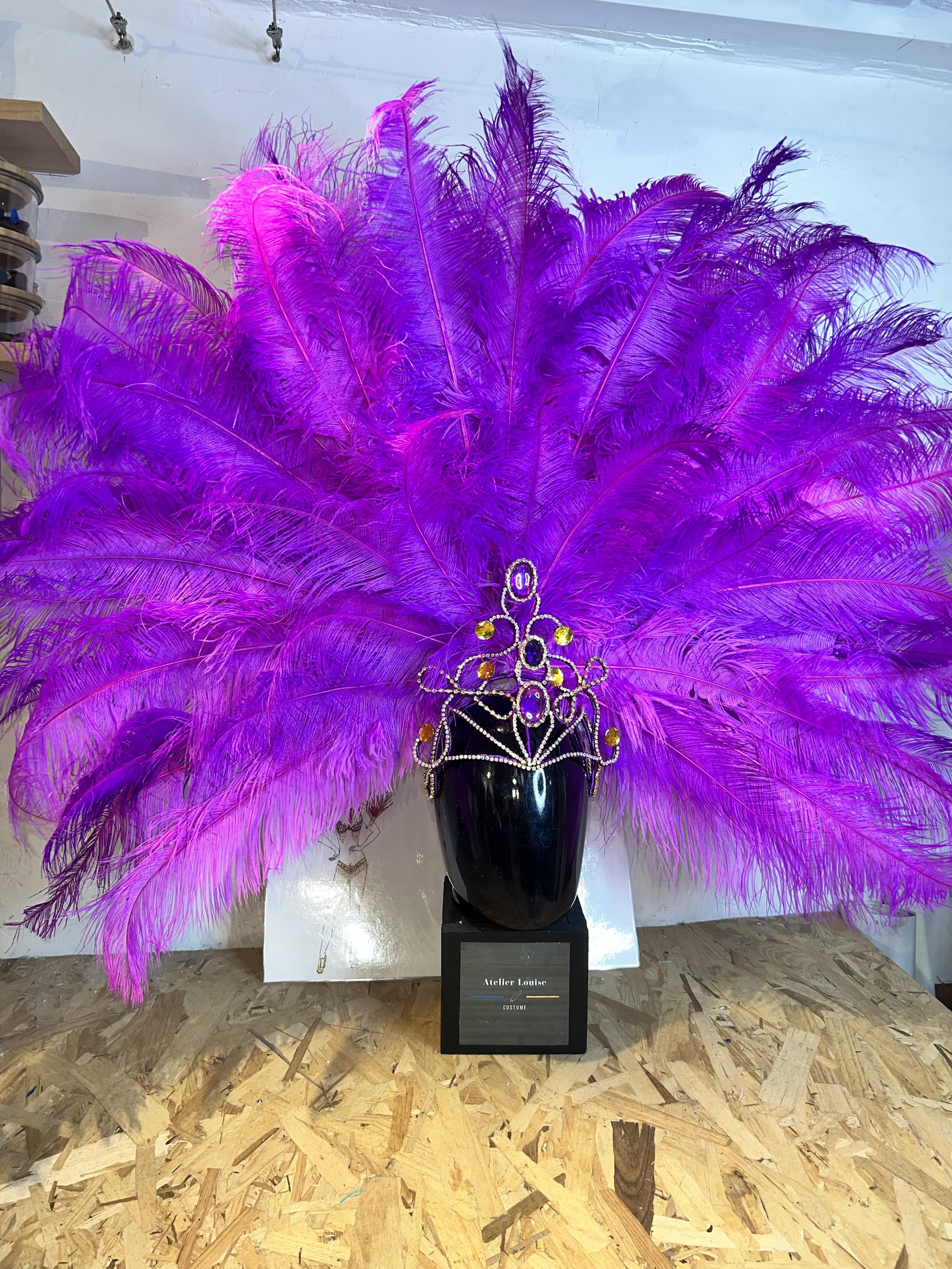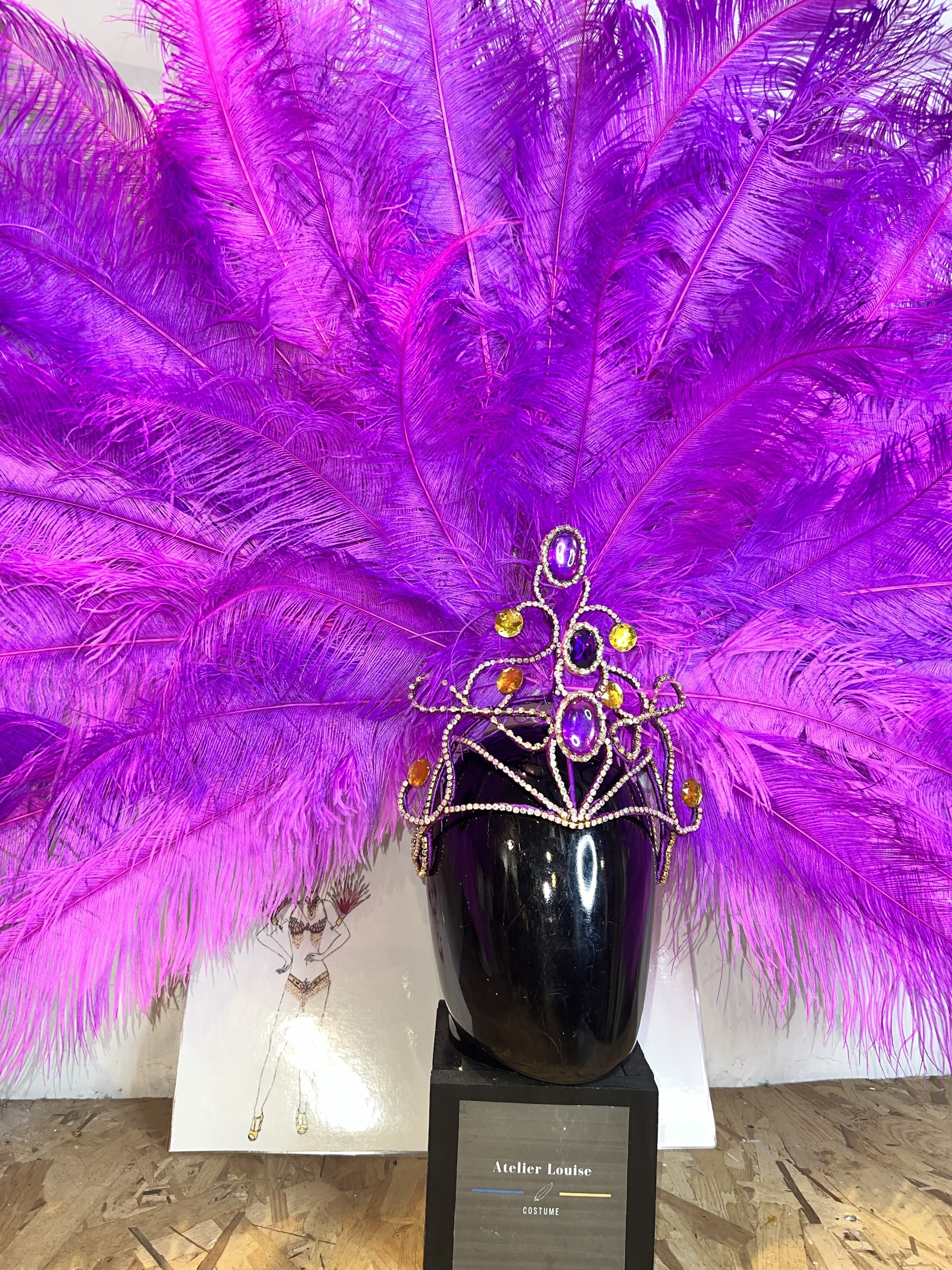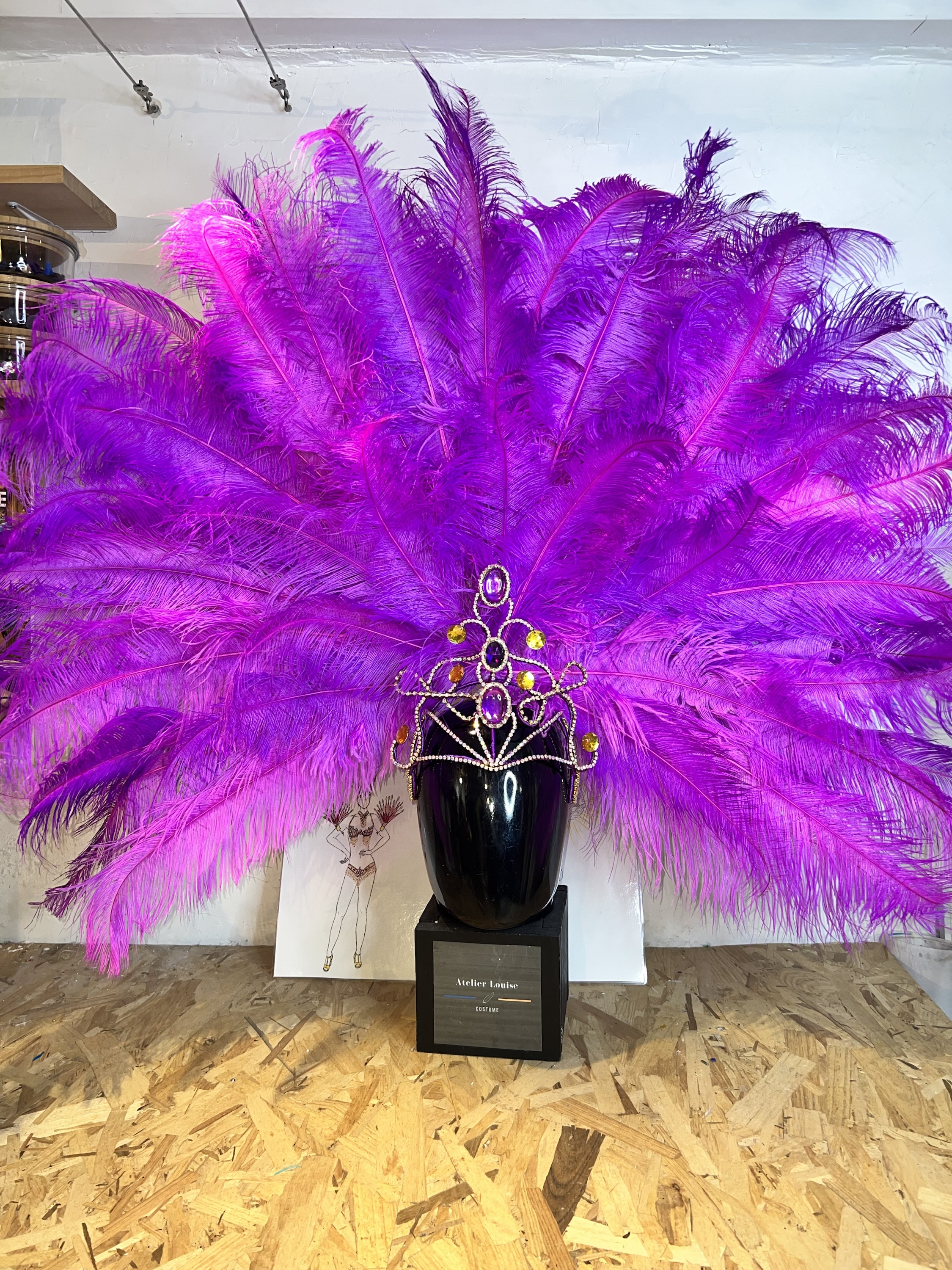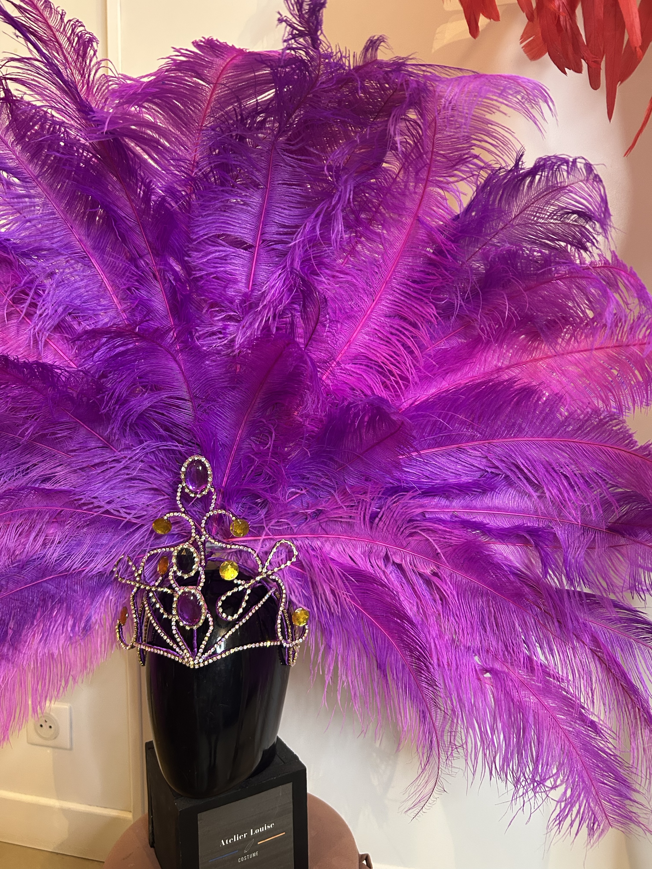 Mélange parfait de glamour et d’artisanat exquis, cette coiffe violette transforme le moindre tournis en un éclat de pur spectacle. Les plumes d’autruche de 50cm l’habillent d’un charme ensorcelant, tandis que sa légèreté et son style détachable offrent à l’artiste toute la liberté d’éblouir ses spectateurs. Chaque fibre brille d’une intensité remarquable, le rendant tout simplement inoubliable.