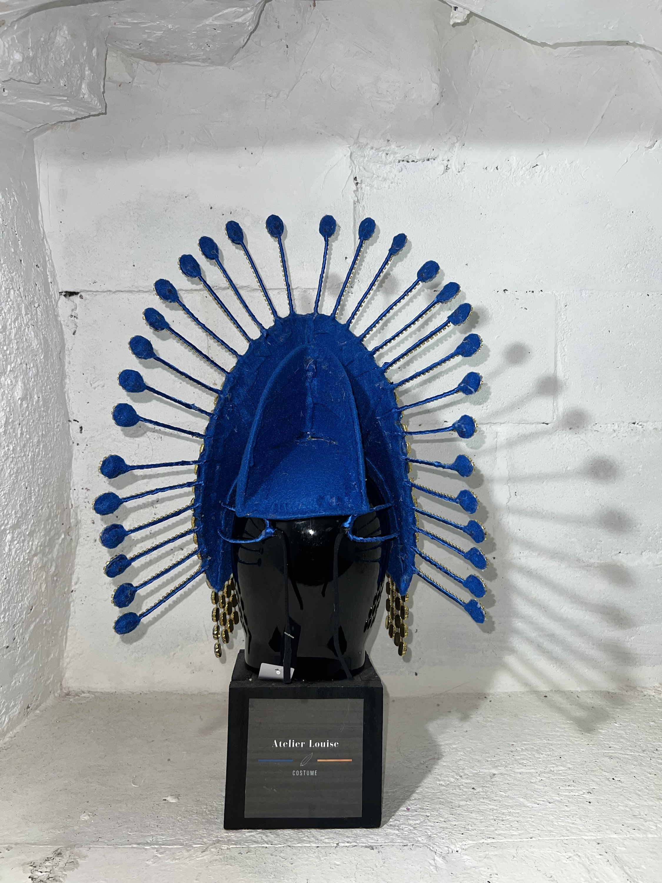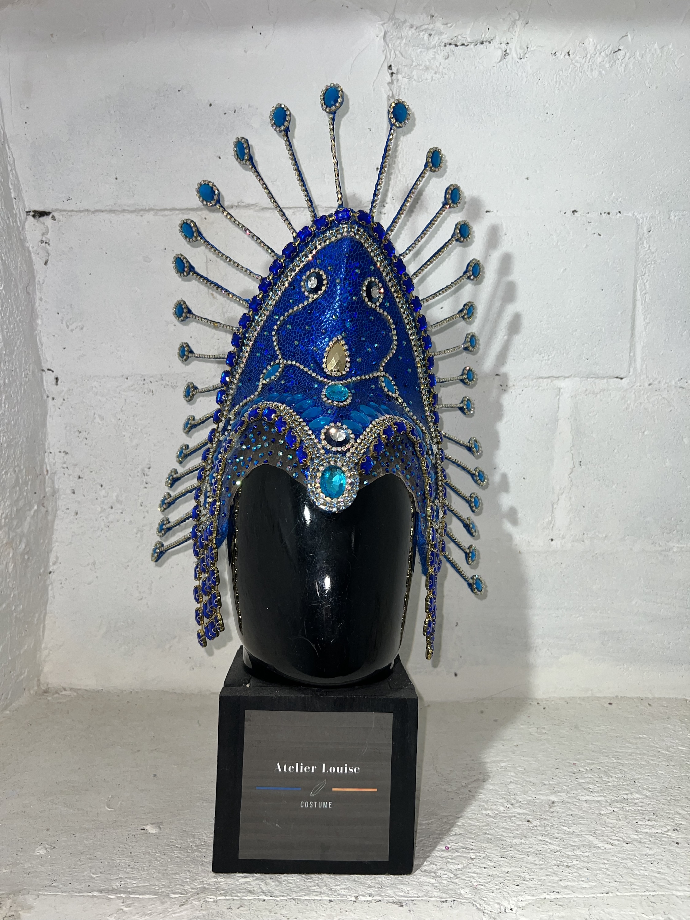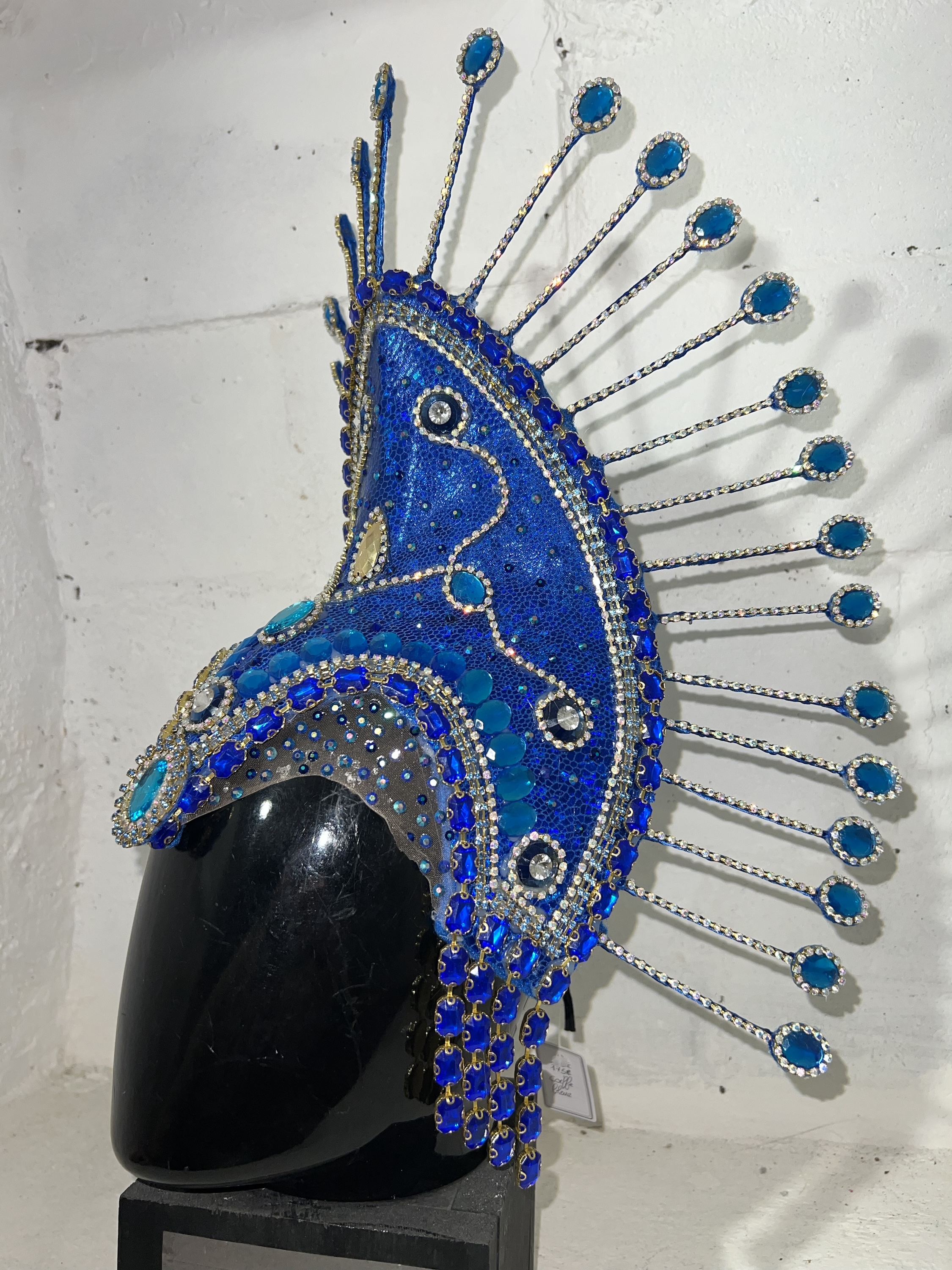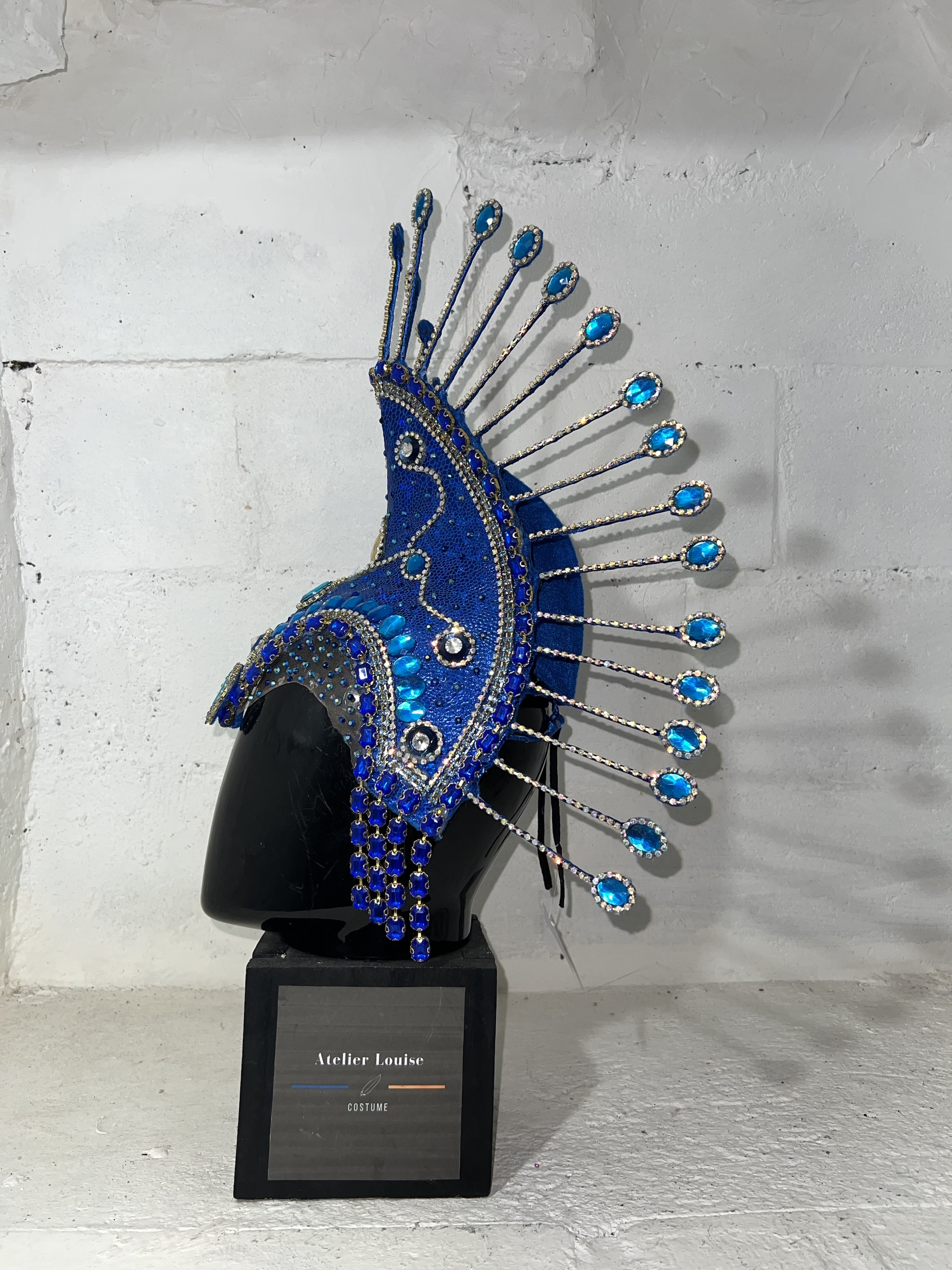 Resplendissez lors de votre prochaine performance avec cette coiffe de samba captivante, ornée de strass scintillants et de tissus bleu brillant.