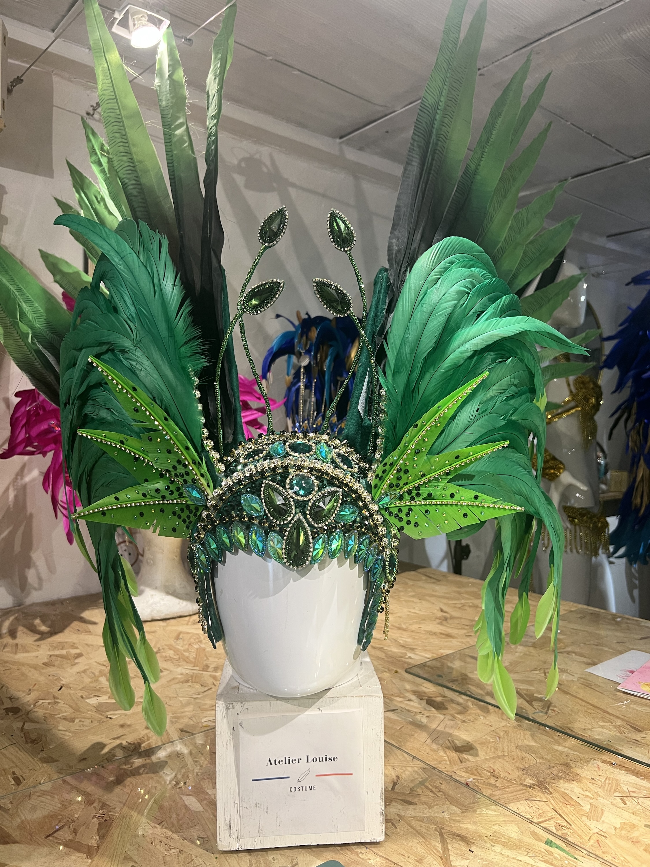 Embrassez le charme captivant d’une création unique qui évoque la splendeur des paysages exotiques. Cette coiffe, ornementée de plumes de coq et de dinde sublimées par des fausses plumes de faisan bicolores détachables, est un hommage vibrant à l’élégance sauvage. Les strass étincelants ajoutent une touche de magie chatoyante, tandis que la magnifique teinte verte du tissu insuffle une sensation de fraîcheur et de renaissance. Parfaite pour émerveiller durant les carnavals et spectacles, cette pièce sophistiquée est une célébration inédite du style flamboyant.