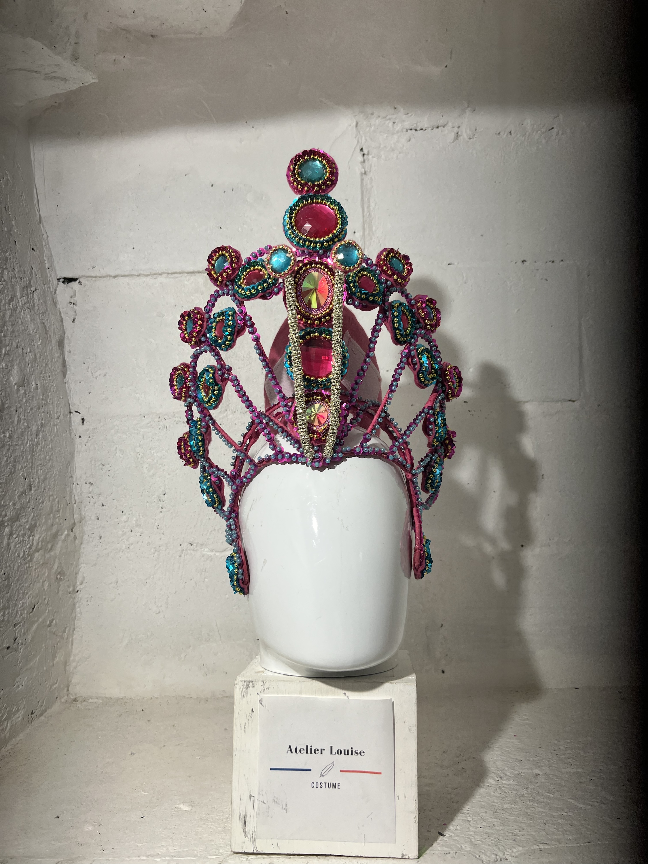 Plongez dans un monde scintillant avec notre coiffe de spectacle, une merveille cousue à la main avec des perles et strass. Cet ornement évoque le glamour envoûtant du samba, du cabaret et de l’art transformiste. Élégance et féerie vous enveloppent tandis que la lumière danse sur chaque facette étincelante. Son design sophistiqué offre également la possibilité d’ajouter des plumes amovibles, vous permettant de personnaliser cette pièce magistrale selon votre humeur et vos envies.