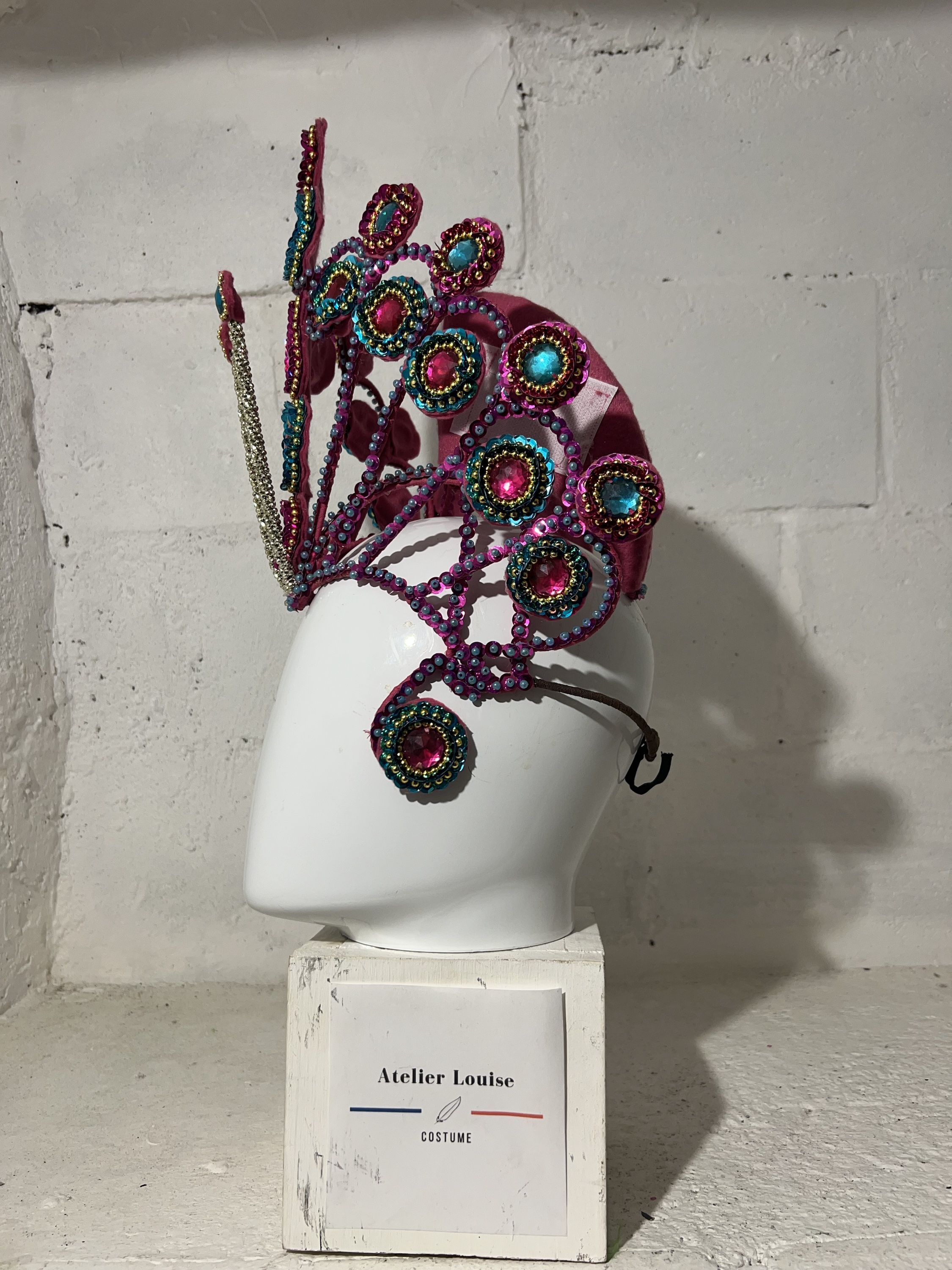 Coiffe de spectacle en perles et strass, parfaite pour l’art scénique. Possibilité d’ajouter des plumes, amovibles.